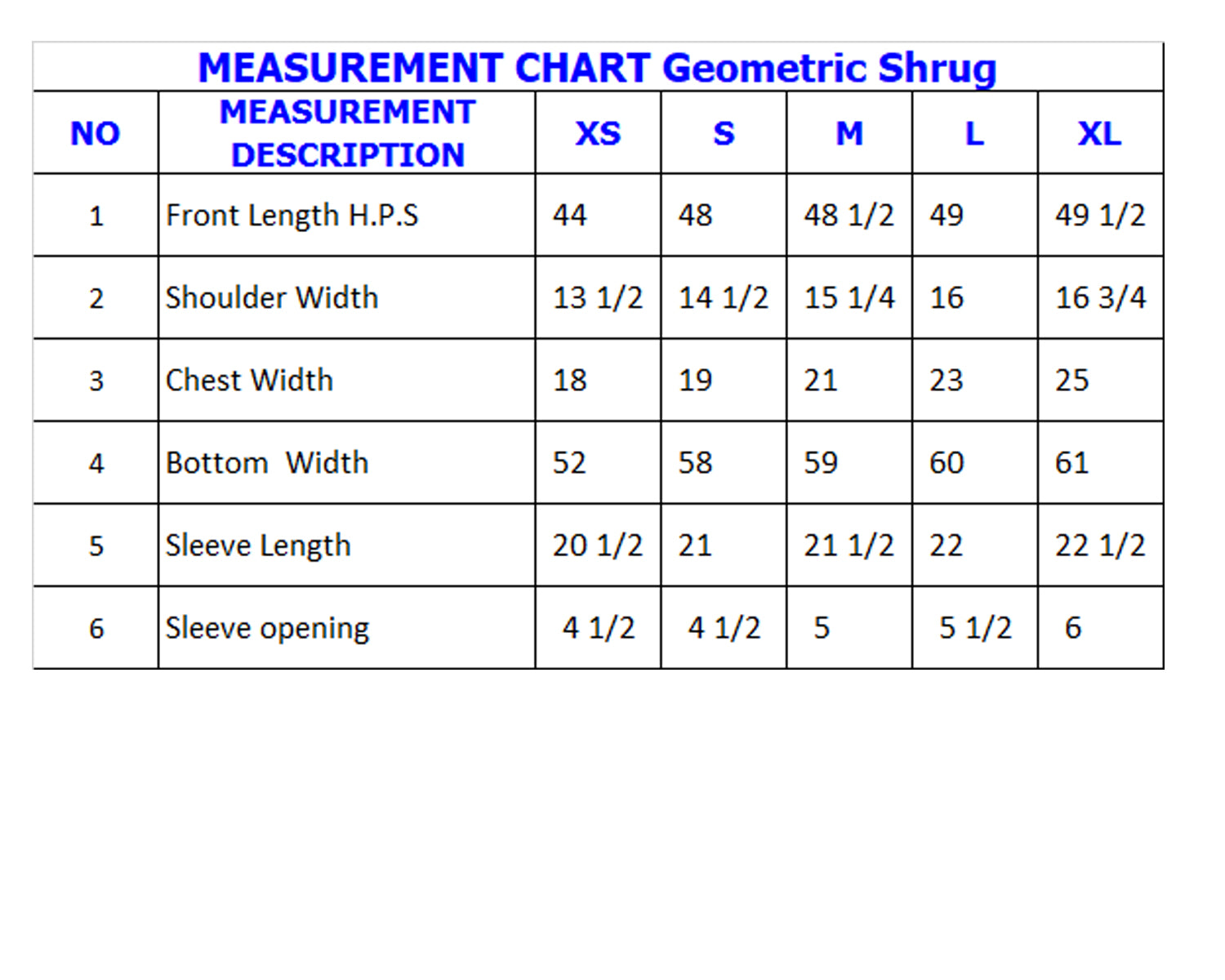 | Sleeve Length Full | 21.5 | 22 | 22.5 | 23 | 23 |