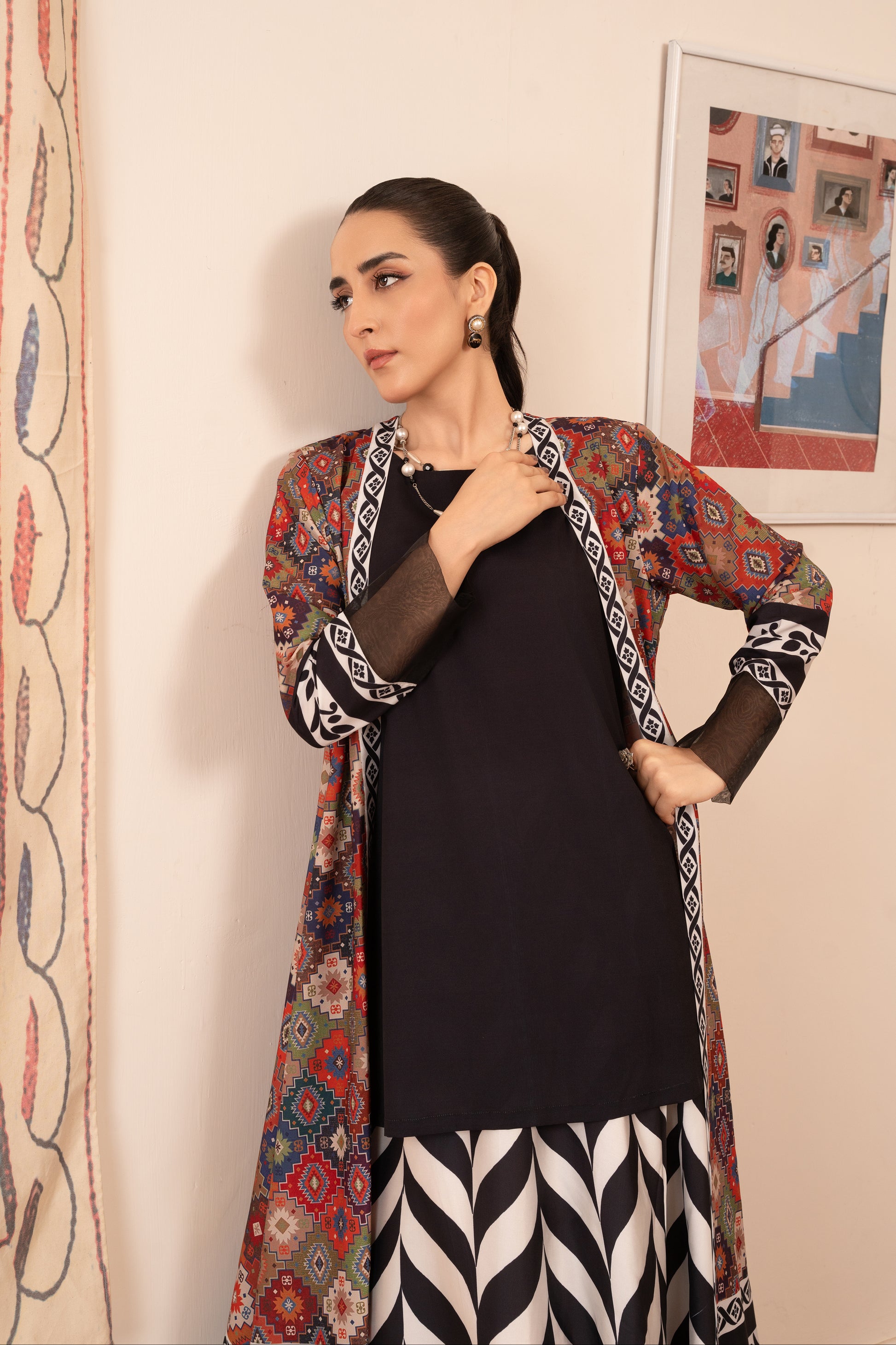 This Shrug with Geometric print and bold borders made in soft crepe, features a front-open silhouette , full-length sleeves and side slits. Black Organza patching borders have been added across the hemline and sleeve openings.