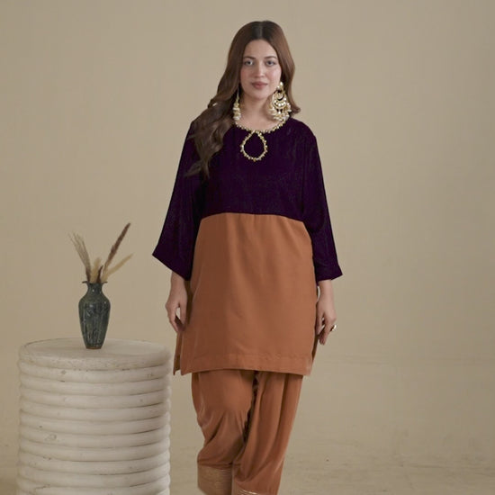 Shirt Length 37". Elevate your festive wardrobe with this exquisite Gold Color Block Dress, designed to make a statement with rich textures and elegant detailing. The top is crafted from premium purple and gold Phoenix velvet, creating a striking contrast that reflects timeless luxury. A beautifully embellished neckline with stone detailing adds refined sparkle, perfect for festive and formal occasions.