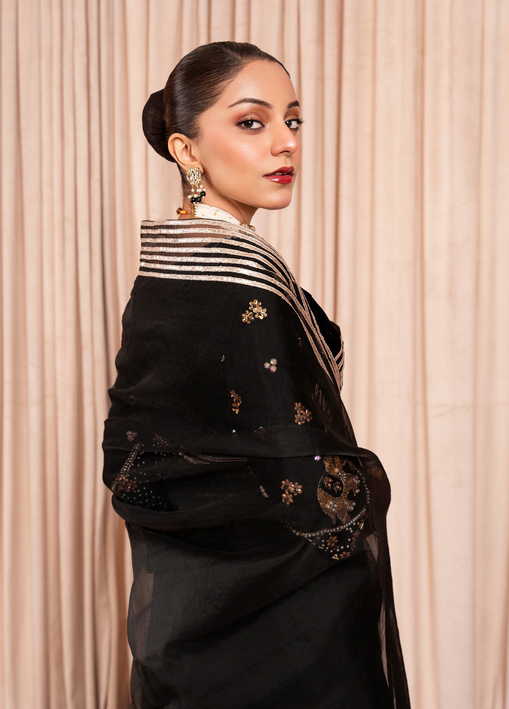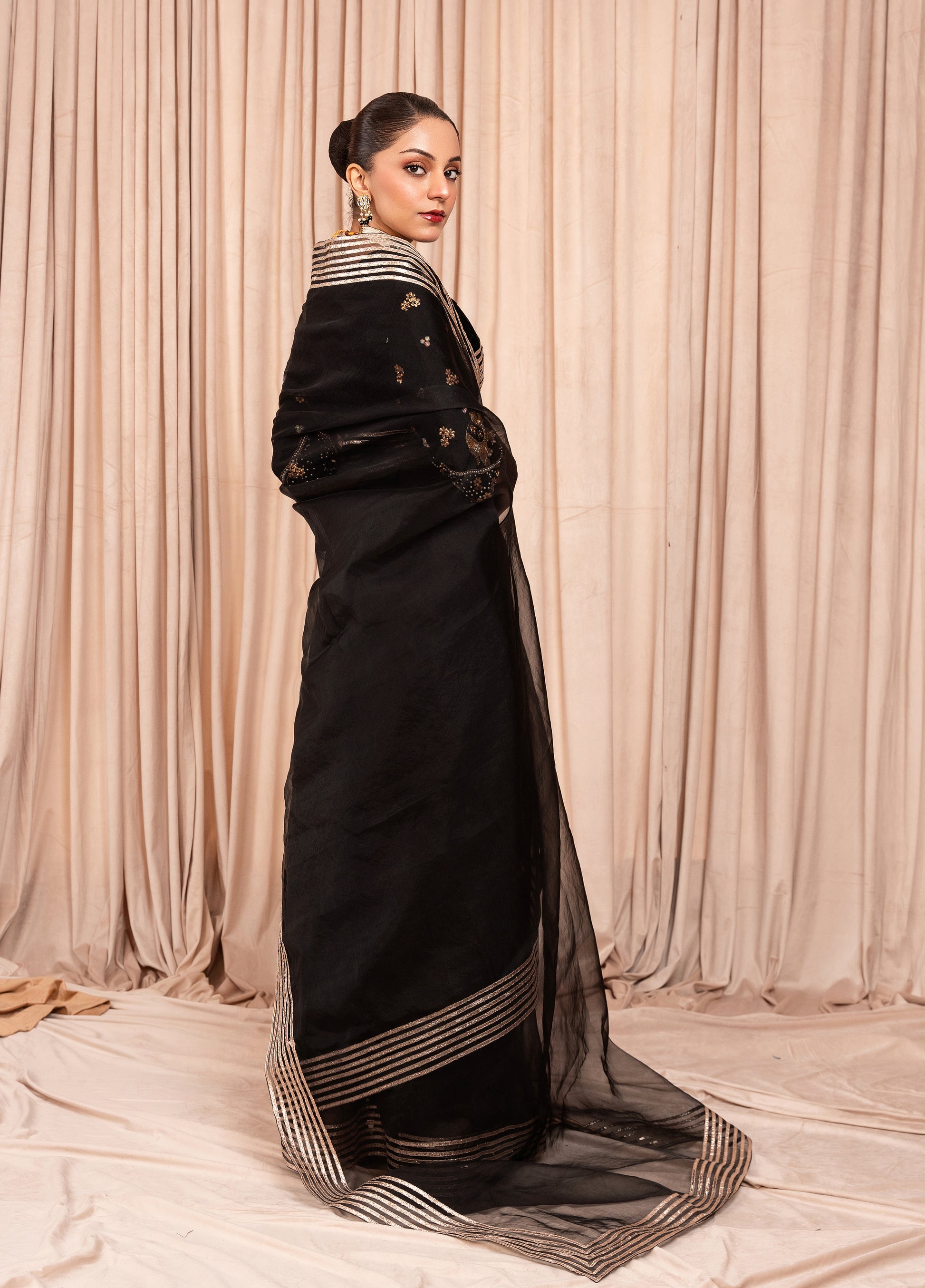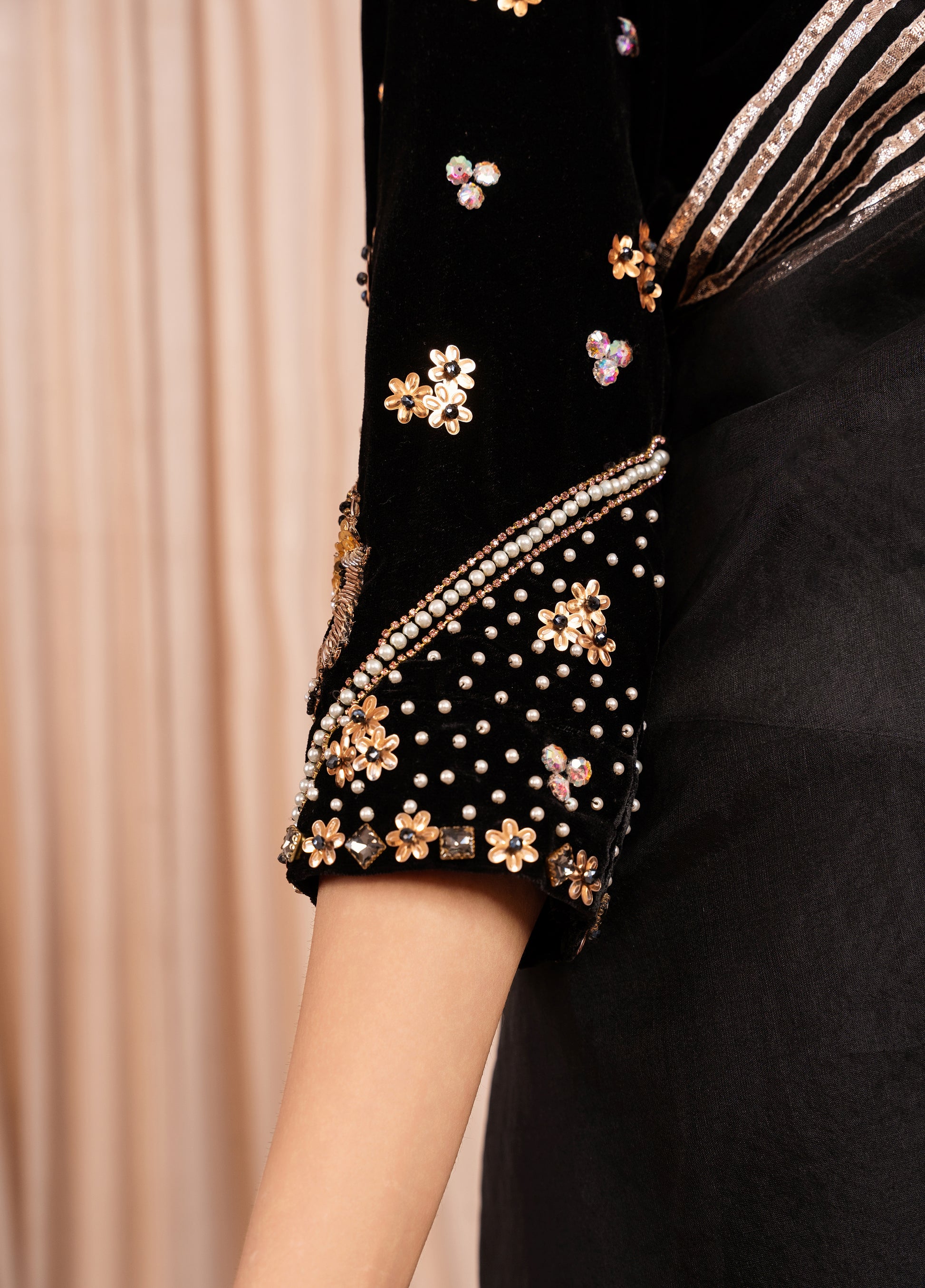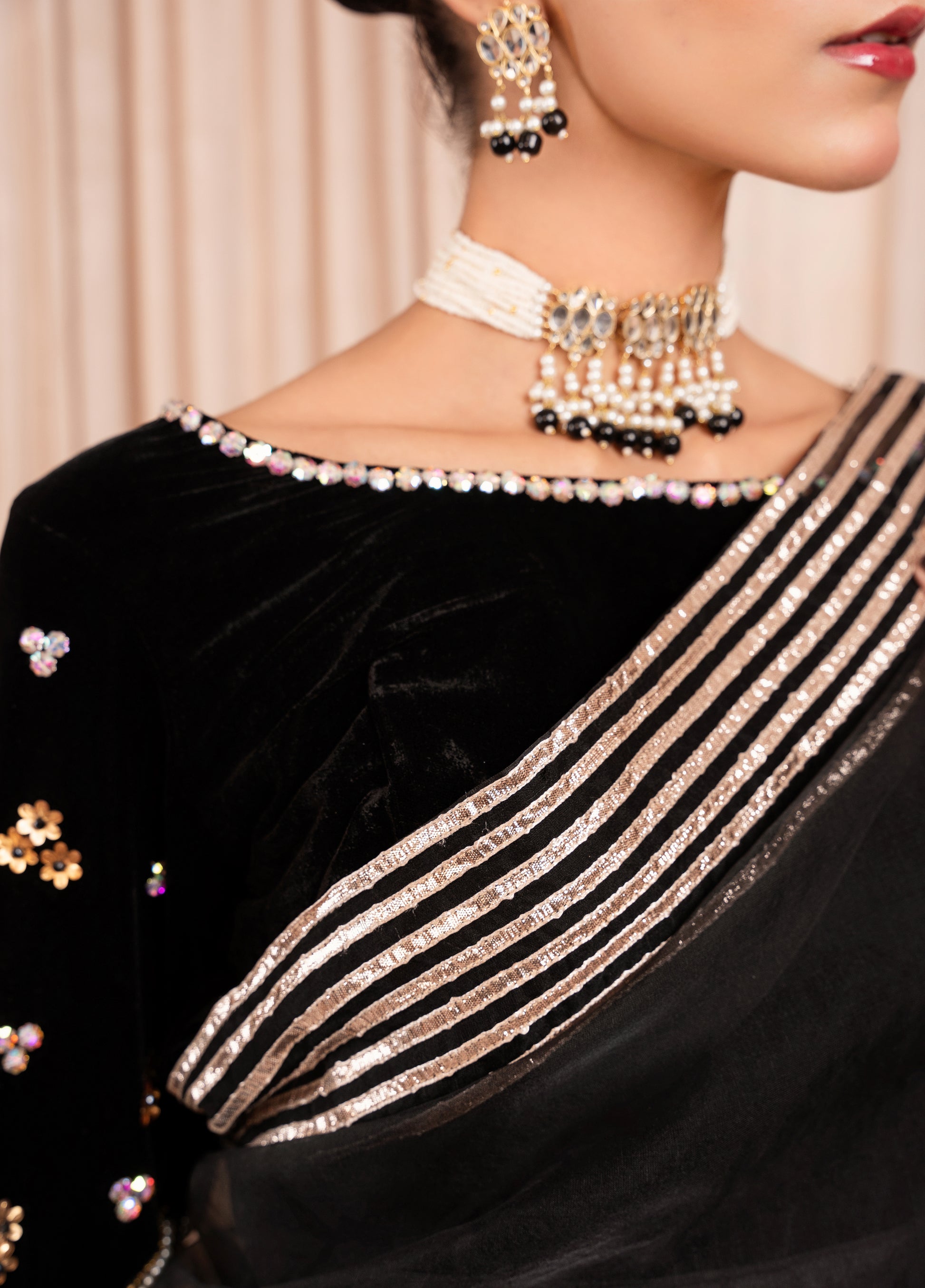 The Black luxuries micro 9000 velvet sari blouse is a perfect combination of elegance and glamour. The luxurious velvet fabric is complemented by the sparkle of the stones and the classic sophistication of the pearls, making it an ideal choice for a formal sari look. The embellishments enhance the blouse, drawing attention to the neckline & sleeves. The defining feature of this pallu is the golden lace that runs around the entire edge. The lace is intricately designed, with fine golden threadwork that contrasts beautifully against the sheer Black Organza. This Sari would be perfect for special occasions such as weddings, festive events, or formal gatherings..