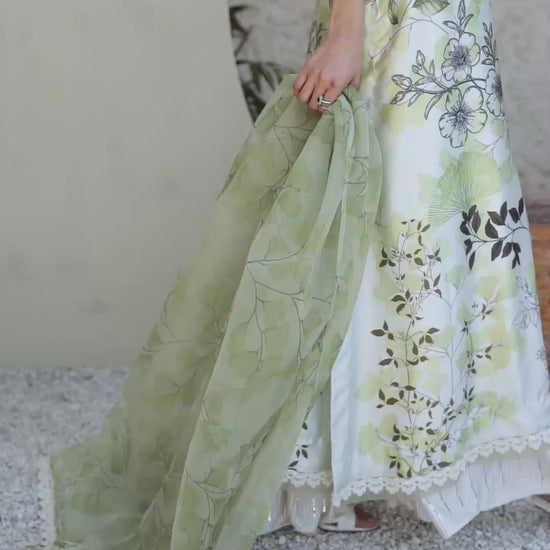 This stunning ensemble features a Charmeuse Silk floral printed shirt, crafted from a luxurious fabric that gives a soft, silky sheen. The shirt is beautifully adorned with lace work at the neck, sleeves, and bottom, adding a touch of elegance and intricate detailing. Paired with the shirt are off-white foil printed trousers, which offer a neutral yet refined base. The trousers are detailed with peco work at the bottom leg, adding a unique, intricate touch that highlights the artistry of the design. To complete the look, the ensemble includes a printed organza dupatta that mirrors the floral motifs of the shirt. The sheer fabric of the dupatta provides a soft, delicate finish, and the print ties the whole outfit together, giving it a cohesive and elegant look.