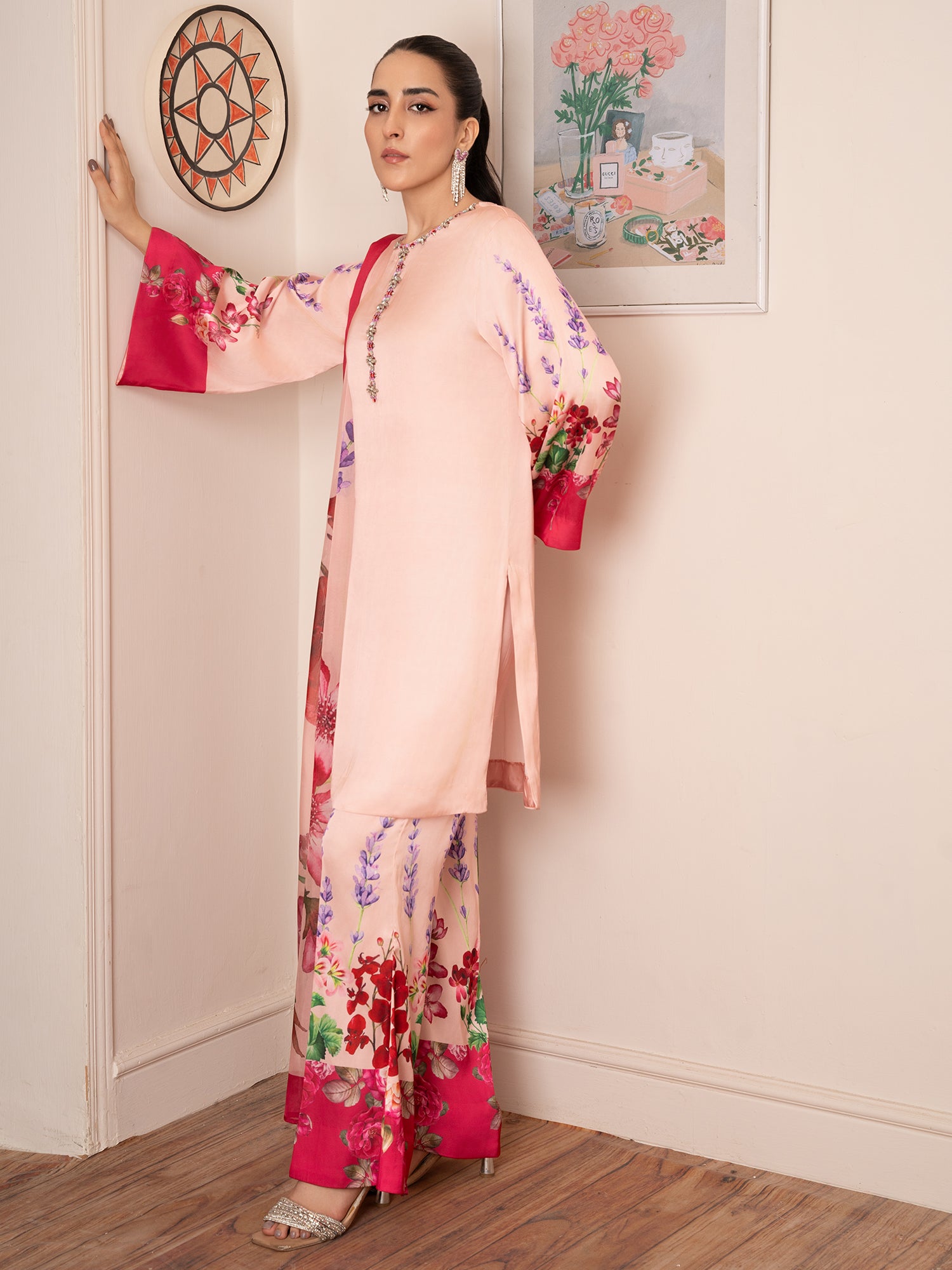 The Peach Pink Embellished Dress made in Charmeuse Silk along with Silk Dupatta, a breathtaking piece that combines timeless elegance with modern flair & neckline is elegantly styled. This dress is perfect for special occasions, exuding a sense of sophistication and charm. Standout feature of this dress is its intricate neck embellishments..