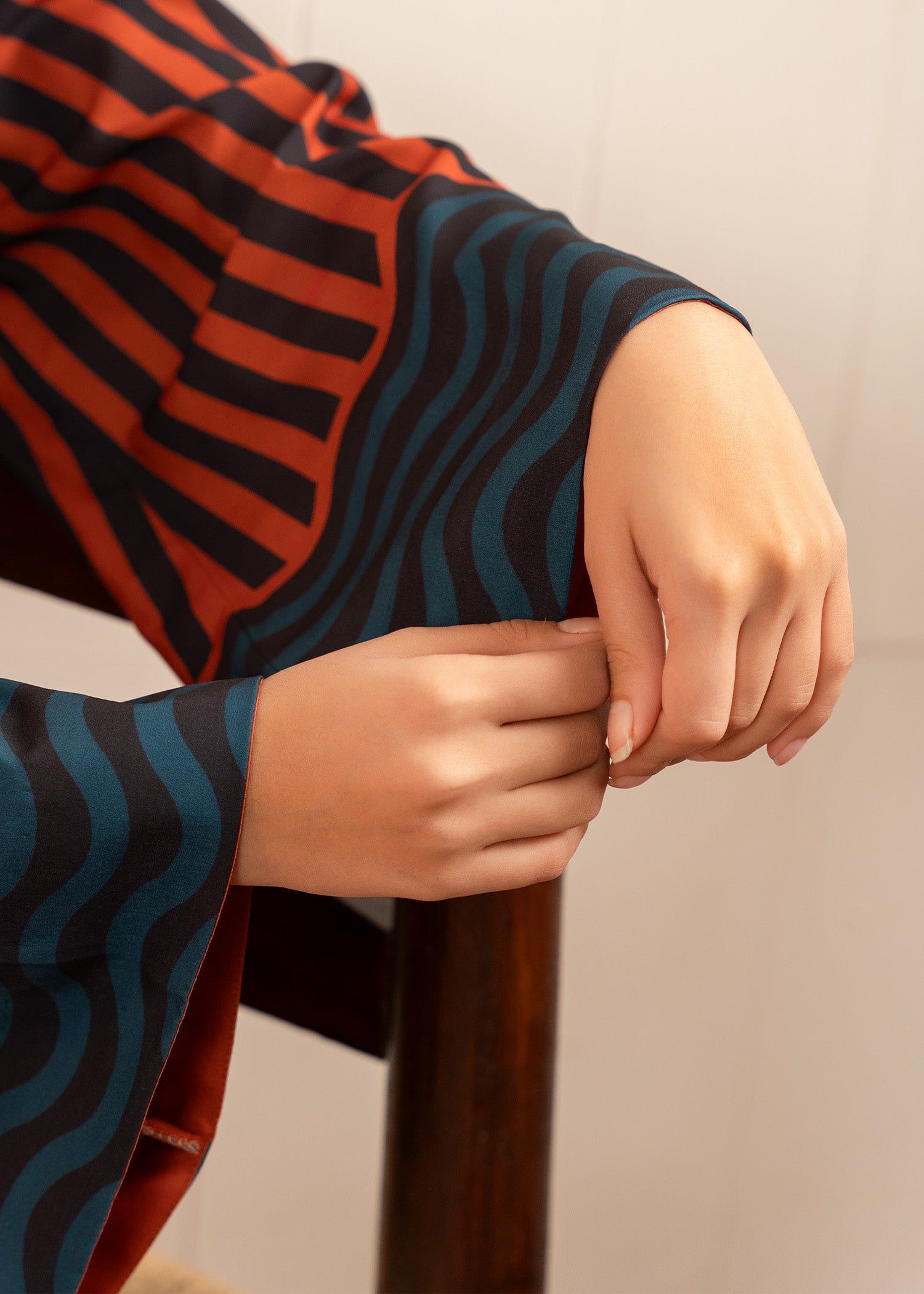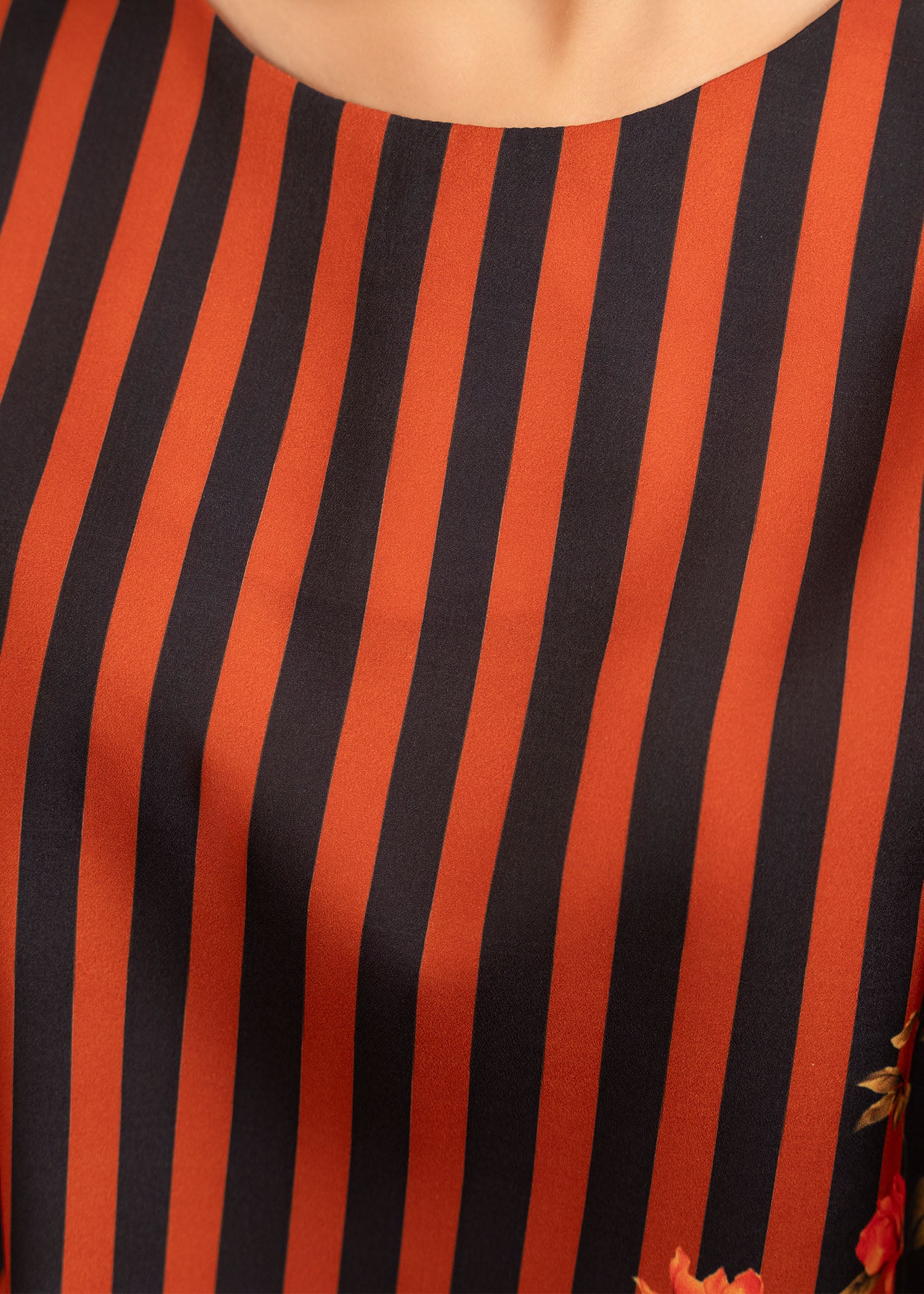 The short shirt in rust stripe paired with culottes is a stylish and modern ensemble. The shirt features a warm rust stripe pattern that adds a rich, earthy tone, while the floral print brings a touch of femininity and vibrancy. The bell shape sleeves provide a casual feel, perfect for warm weather.