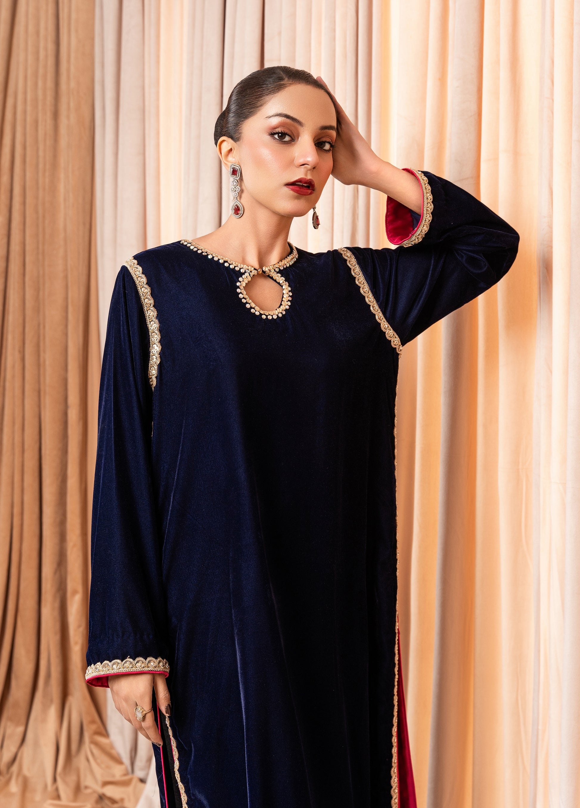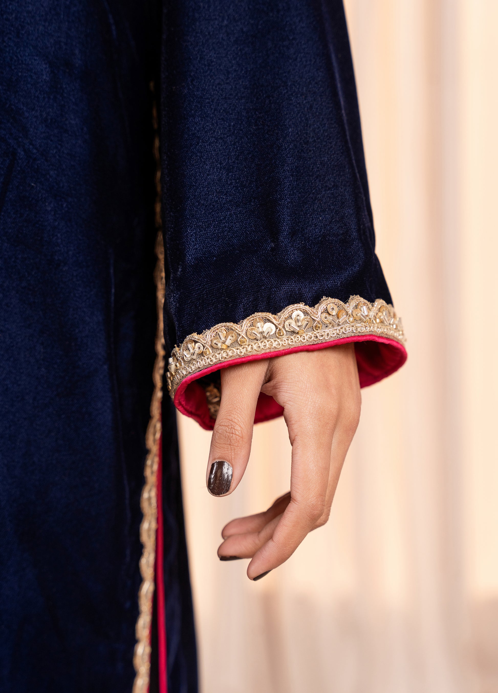 The dress is made from luxurious Navy Blue micro 9000 velvet, a fabric known for its rich texture and subtle sheen. The neckline of the dress is beautifully embellished with stone work, featuring sparkling crystals that are carefully arranged to form an intricate design. The armholes, cuff and side slit of the dress are adorned with lace detailing, which softens the sharp edges of the garment and adds a delicate touch. This lace attachment adds a layer of femininity and grace, creating a balanced combination of softness and sophistication. The slit is beautifully framed by contrast pink piping, which creates a striking visual contrast against the navy blue velvet.