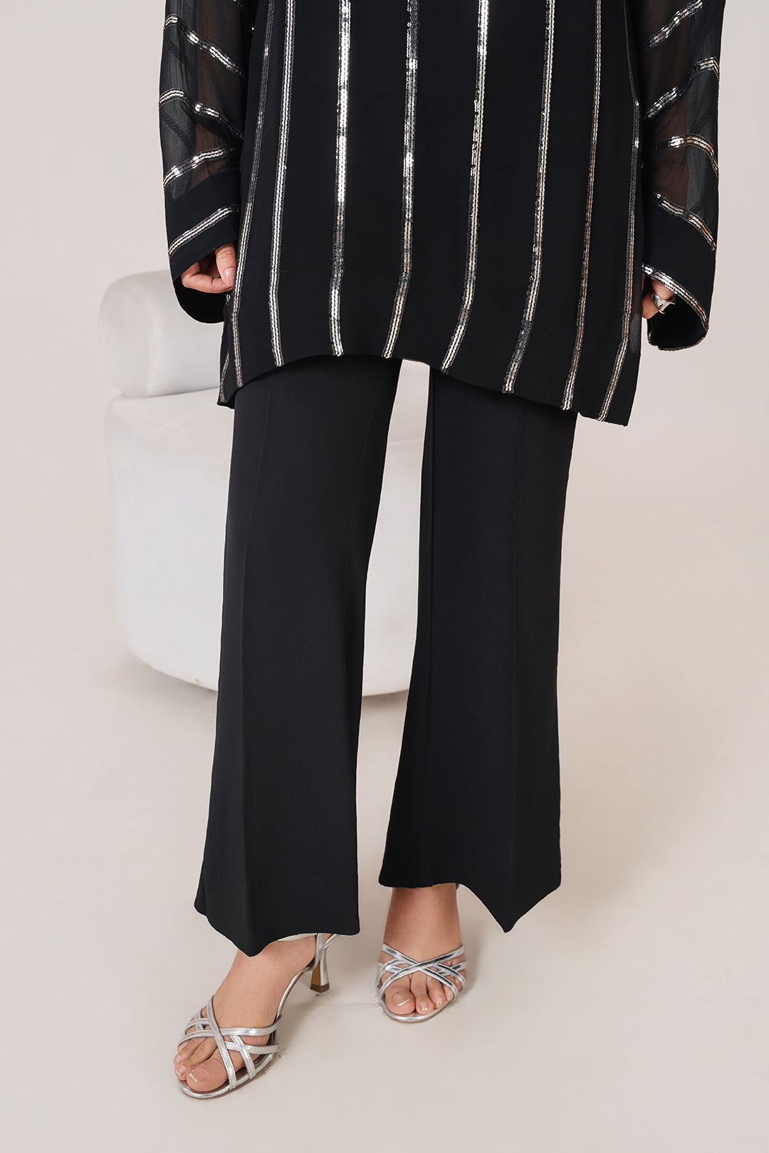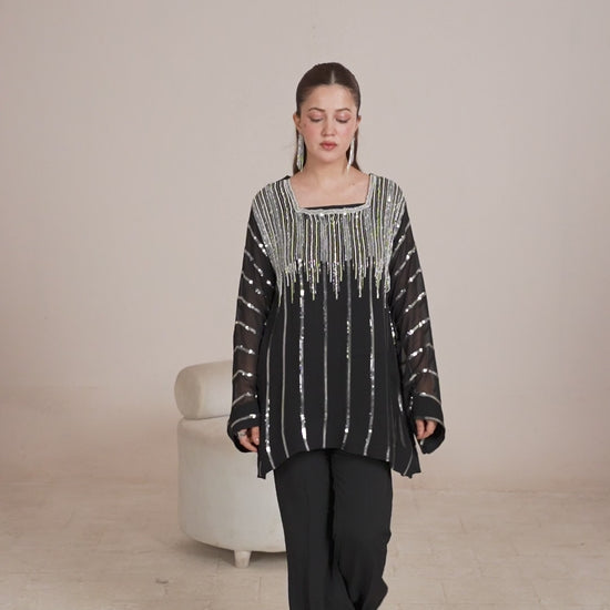 Make a statement with this stunning ready-to-wear black ensemble, designed for women who love timeless elegance with a touch of sparkle. The shirt is crafted from premium crinkle chiffon adorned with all-over sequins that catch the light beautifully. The look is further elevated with delicate stone work on the front, adding a refined, glamorous finish.