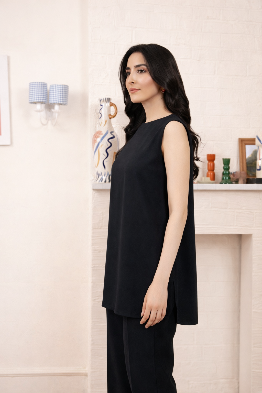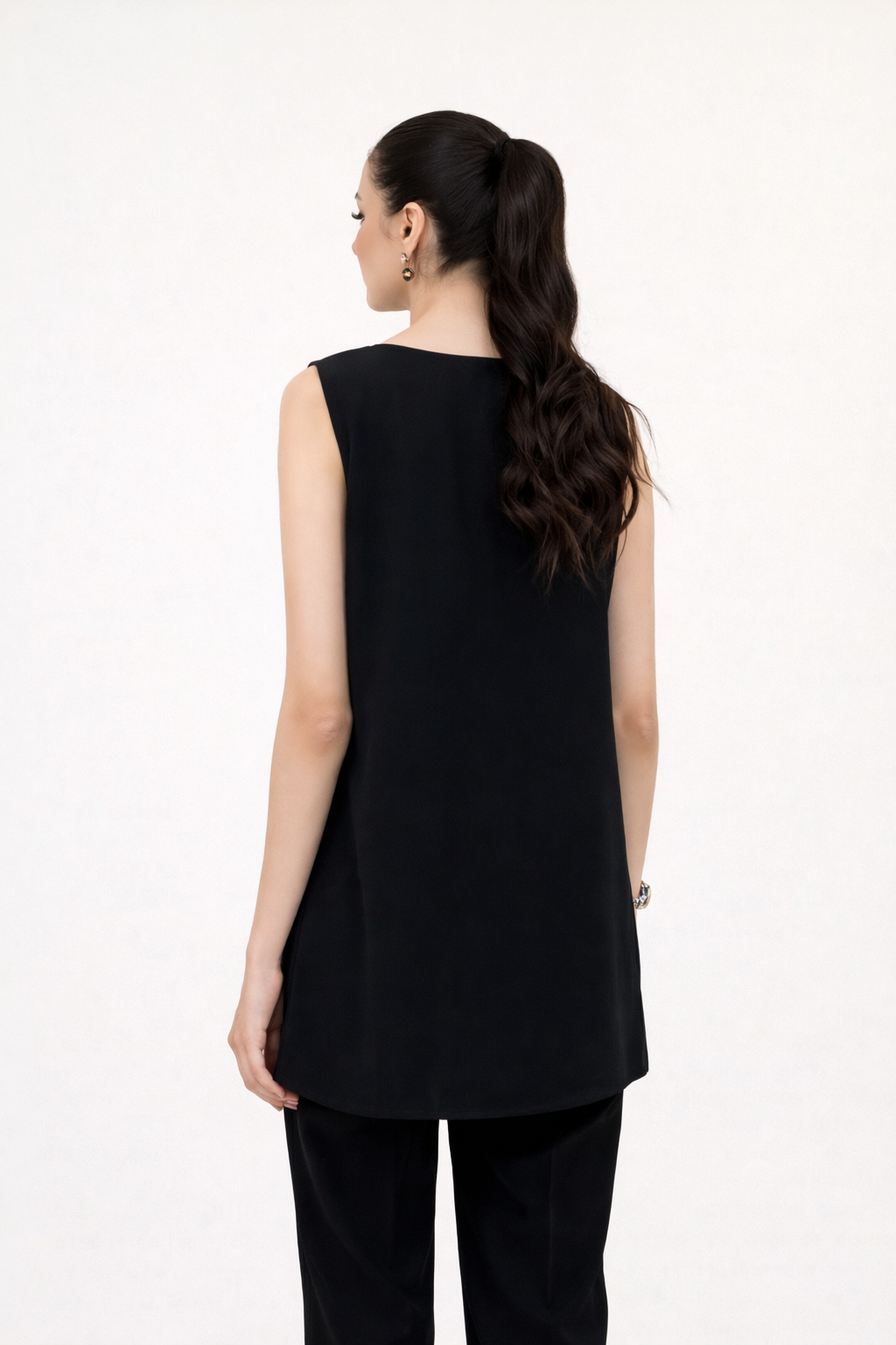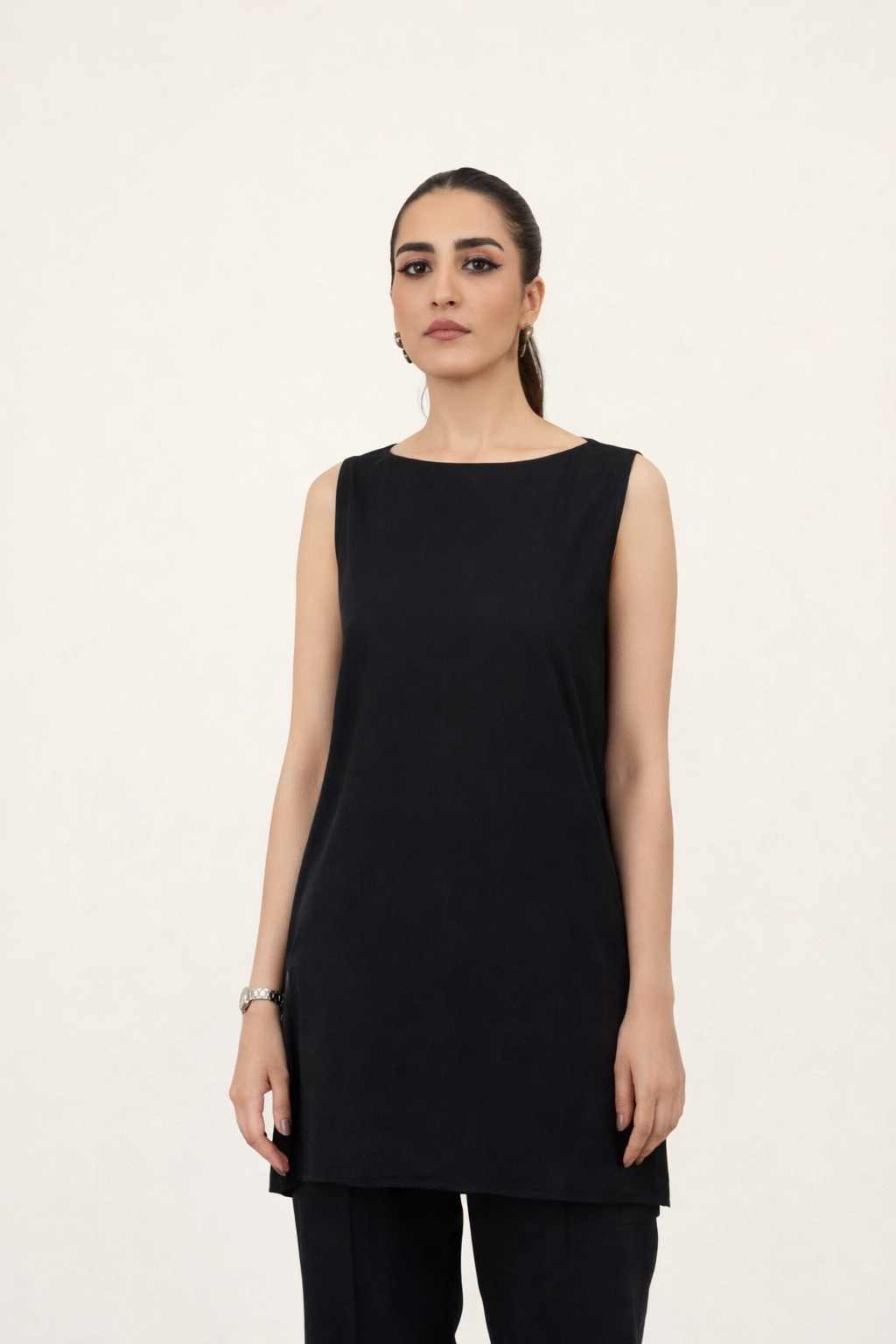 This sleeveless undershirt made in soft Black Crepe fabric features a boat neckline and side-slits.