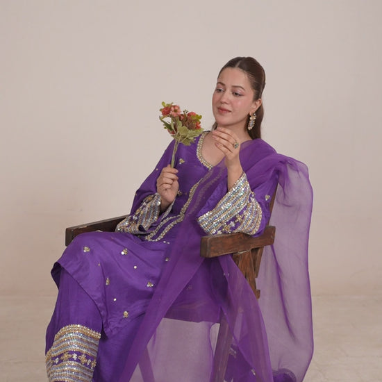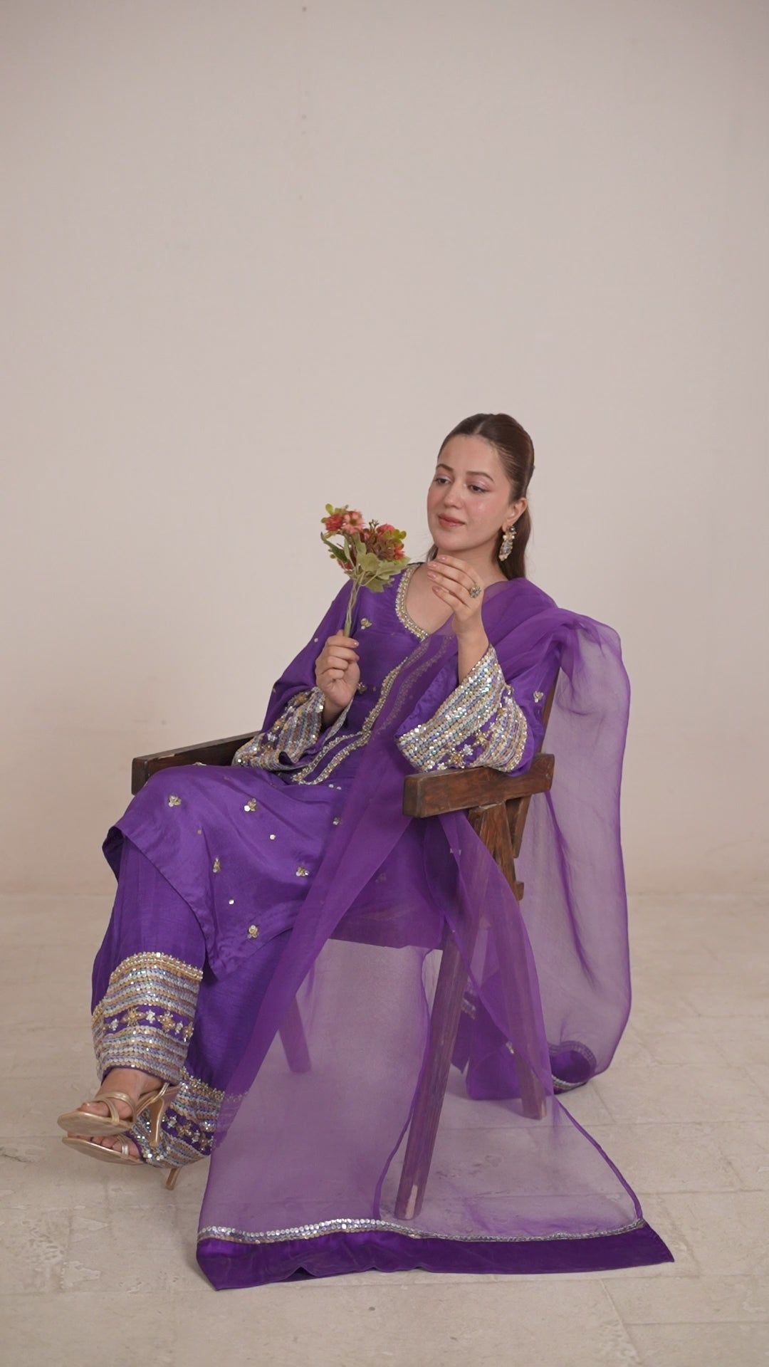 Step into refined elegance with the Violet Mist Dress, a luxurious three-piece outfit crafted for timeless festive appeal. The shirt is beautifully embellished with intricate stone, sequin, and pearl detailing, adding a soft shimmer that elevates the rich violet tone. Designed in pure tissue silk, the fabric offers a lightweight, graceful fall with a subtle sheen that exudes sophistication.