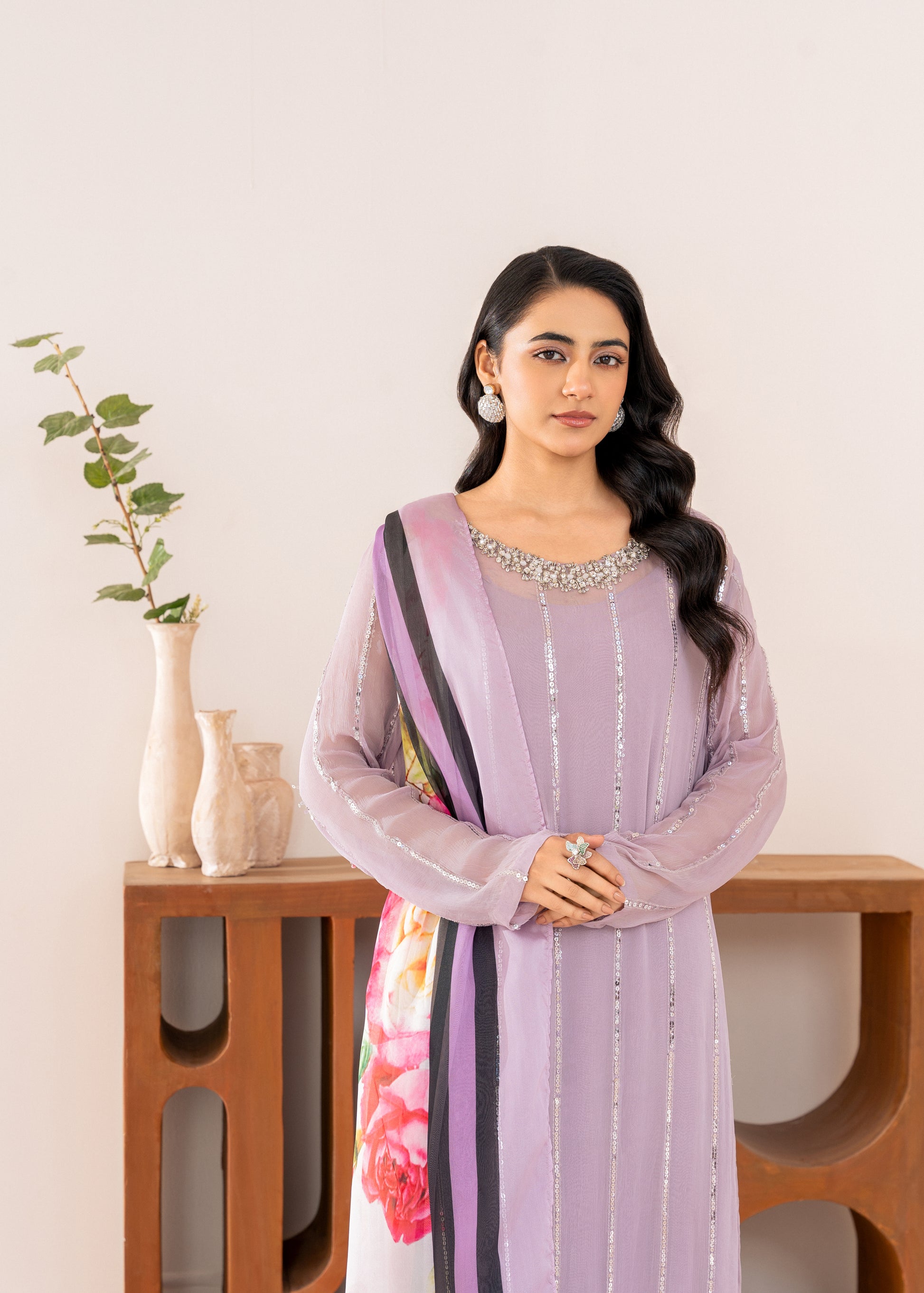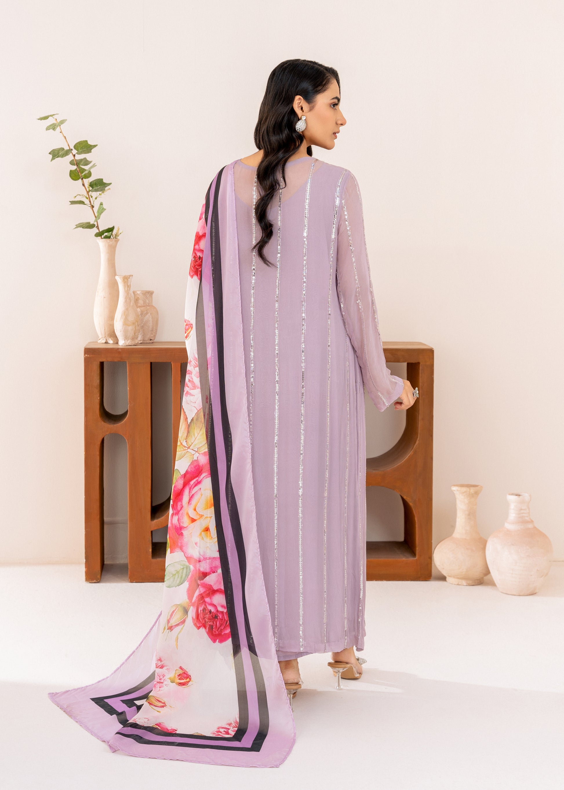Accompanying the shirt is a beautiful silk dupatta, adorned with a soft, floral print in complementary colors that add an artistic, feminine touch. The silk fabric drapes gracefully, with the floral patterns creating a vibrant contrast against the calming lilac of the shirt. The overall effect is a harmonious blend of sparkle and floral elegance.