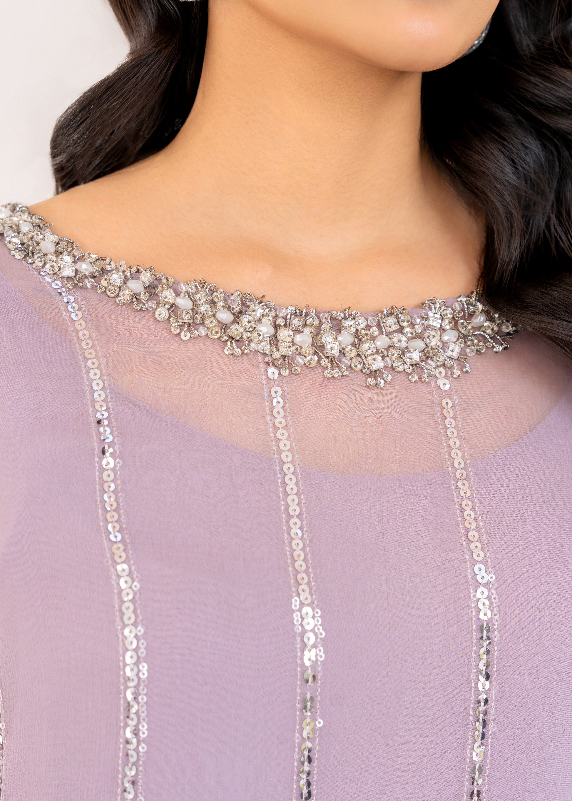 This exquisite lilac shirt is a stunning example of modern elegance, crafted from soft, flowing fabric with a delicate sheen. The shirt features intricate sequence embroidery that creates a subtle, yet captivating texture across the front, with sparkling crystal embellishments at the neckline. The crystals add a touch of glamour, highlighting the delicate embroidery and drawing attention to the collar area, giving it a refined, luxurious look.